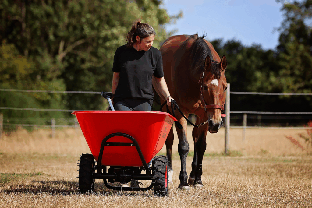 Its all-terrain wheels grip in mud, gravel, and grass, and the electric drive builds up speed gradually for safe, controlled handling—perfect for tight turns around stables and gateways. Designed specifically for equestrian life, the large tub fits what you actually need to carry, and the sturdy metal frame means it’s built to take a beating.